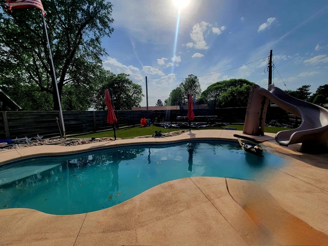 This completely updated 1,960 Sq Ft Ranch Style home sets on a corner lot, with amazing curb appeal. The home is a three bedroom, two bath, with an open concept kitchen and living room and fireplace, partial basement and attached garage. The charm and beauty of the property is completed with a privacy fenced backyard paradise, featuring an in-ground pool, temperature controlled concrete, astro turf and shaded entertainment area.