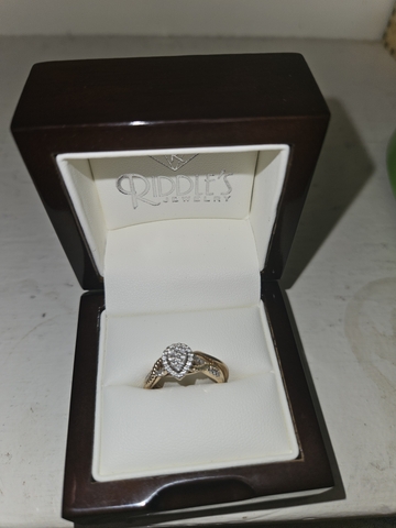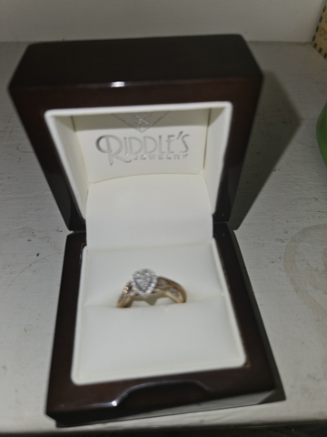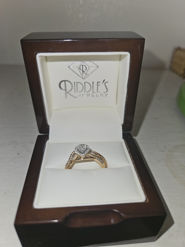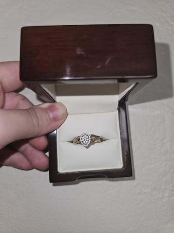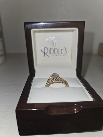 Great condition. Had a 20 day return policy and went over the 20 days so we couldn't return it. Bought for $1000 asking $800. Comes with the wedding band and two different ring boxes for the ring.