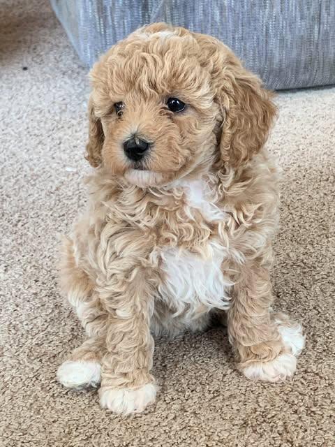 The Mini Goldendoodle puppies should be between 15 - 25 pounds and stand 14 - 15 inches tall when full grown. Possible colors include apricot, cream, parti, black, silver, blue, and phantom. White markings are likely. We have opened the waitlist. Asking $2,000 for them.