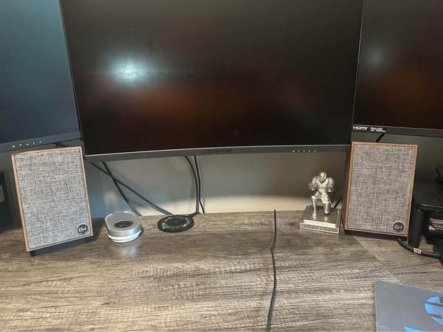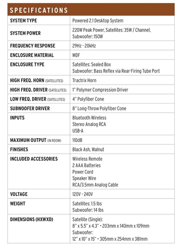 KLIPSCH 2.1 Bluetooth multi-speaker system. 1" soft dome tweeters on Tractrix horns, Each speaker also features a 3" long-throw woofer for dynamic, powerful midrange, best-in-class 8" subwoofer with a 100-watt amplifier. Nothing wrong with these, has great sound quality , and bass. Only selling to upgrade to a 5.1 setup. Perfect computer/gaming pc setup.