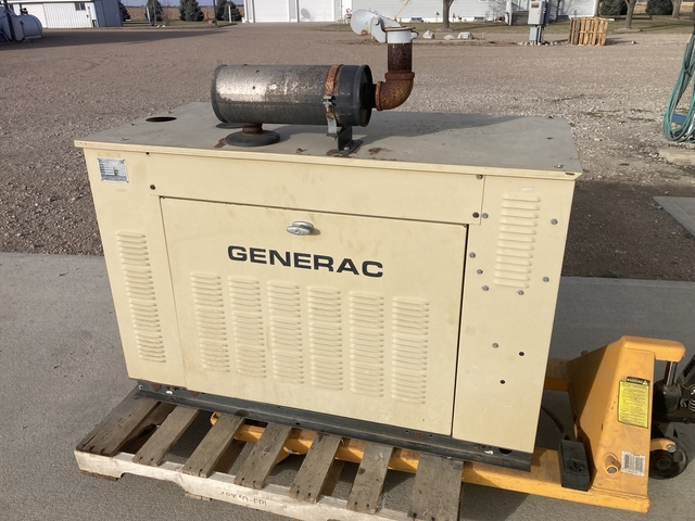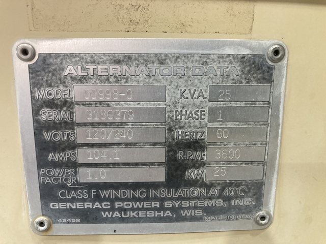 Generac 25KW 220 single phase standby generator. Mitsubishi 1.5L water cooled engine, 3600 RPM, new starter and timing belt. Runs on propane. Auto transfer switch, or run without. Battery not included. Can here run, shows 198 hours.