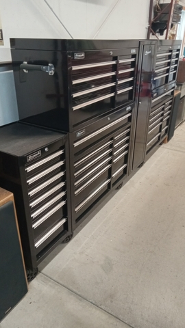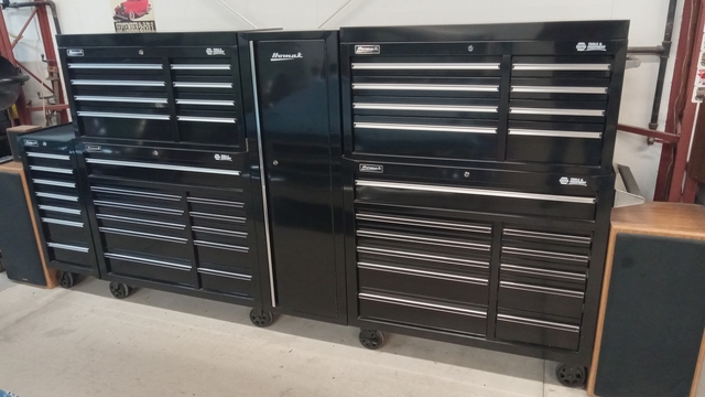 Homak Pro II Series 45 drawer large combo tool box. 10' in length. Center locker has adjustable shelf with 2 drawers. Excellent condition. 785 259 4669.