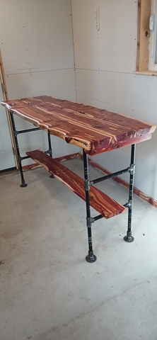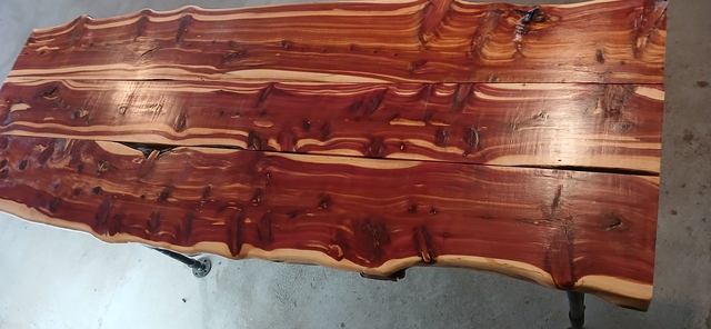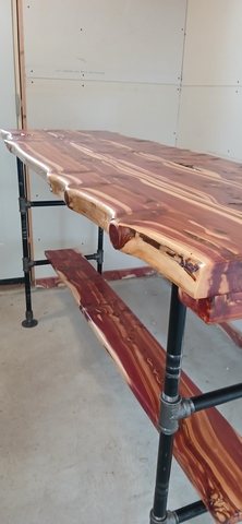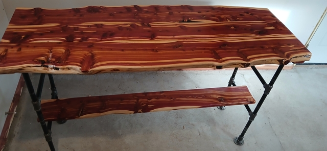 I make furniture in my spare time out of locally sourced timber. I have a cedar slab table available, 1 3/4" thick with a lower shelf that's 1". It's 5'6" long and about 22" wide. The steel pipe legs are 3 feet tall. Some assembly required.