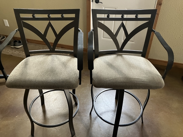 set of 4 counter height bar chairs. Excellent condition. 26" seat height from floor to top of cushion. Metal base with swivel seat. Sage green. $200 for the set of 4.