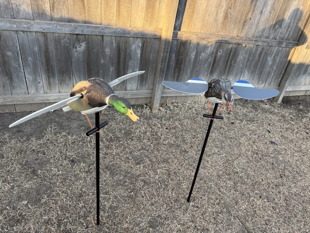 Excellent condition Lucky Duck mallard spinning wing decoys. Comes with new rogers bag, all poles, good rechargeable 6v batteries, 2 sets of new wings and a lightly used set, and are remote controlled! Work great and used very lightly!