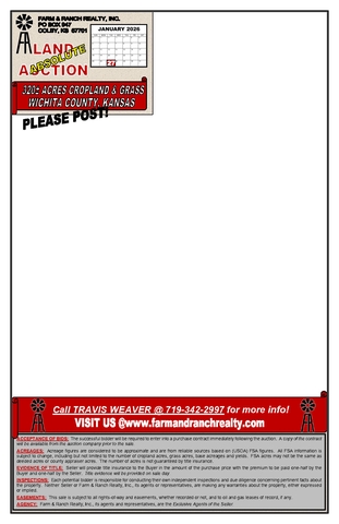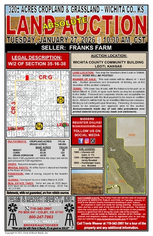 The Franks Farm will sell this tract of cropland and grass at absolute public auction on Tuesday, January 27, 2026 at the Wichita County Community Building in Leoti, Kansas. All cropland is open and ready for spring planting. Grassland is open and has a solar well at the north end of the pasture. The tenant owns the solar panel and well. There is an old house on the property. Access is good from CR G along the south side of the property.