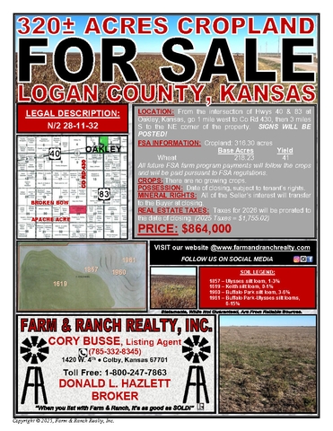 Located just south of Oakley, Kansas, the property is easily accessible from the intersection of Highways 40 and 83. Travel one mile west on Highway 40 to County Road 430, then continue three miles south to the northeast corner of the property. Signs will be posted for convenience. According to FSA records, the tract includes 316.30 acres of cropland, with 218.23 base acres of wheat carrying a yield of 41. There are currently no growing crops. Possession will be granted at the date of closing, subject to tenant's rights. All of the Seller's mineral interest will transfer to the Buyer at closing. Real estate taxes for 2026 will be prorated to the date of closing, with 2025 taxes totaling $1,755.02.
