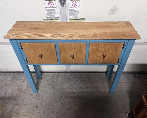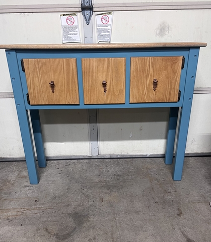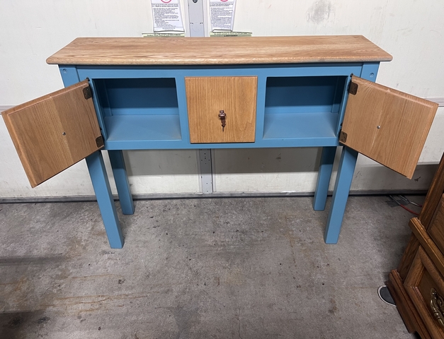 Solid Oak Top Sofa Table with Solid Wood construction with a light teal paint. Inside opens up for storage area. Measurements are 43 1/2” Wide, 11 1/2” Deep, 34 1/2” Tall. (NO HOLDS)(CASH ONLY)(No Deliveries) LOCATED IN HAYS, KS
