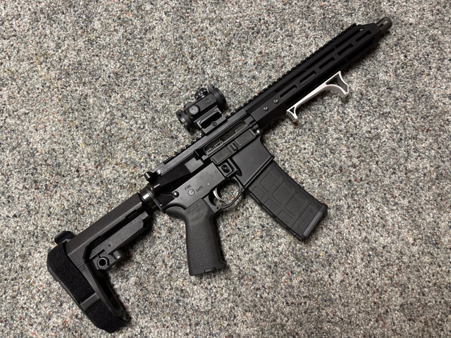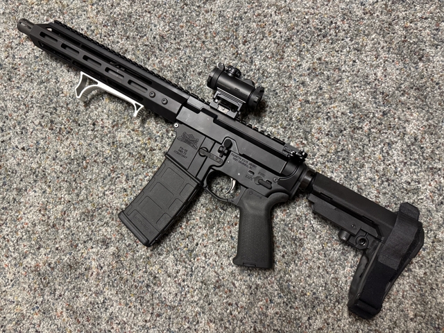 This is a Palmetto State pistol in .300 Blackout with 10-inch barrel, 1:8 twist. Features include Magpul grip, forward hand stop, 300 AAC marked charging handle and Sig Romeo MSR red dot sight. 1 30-round PMAG included. This gun has very few rounds ran through it. I am only selling for much-needed cash. $400 FIRM (NO LOWBALL/CASHLESS OFFERS). FFL TRANSFER ONLY, with NO transfer fee, to be done at FAS in Hays.