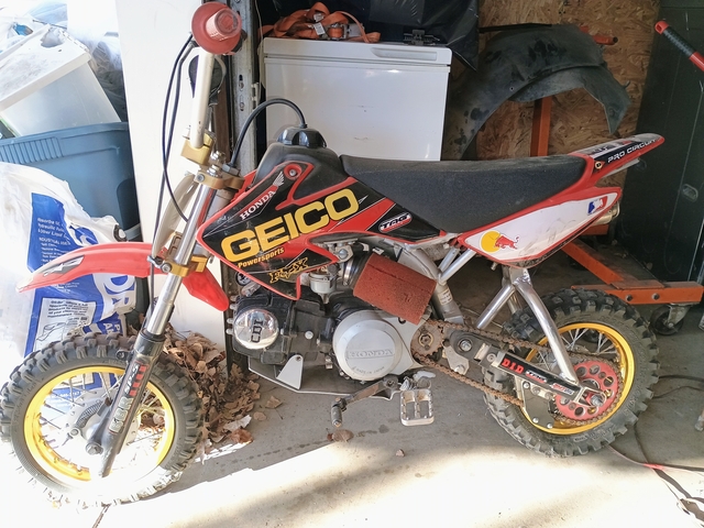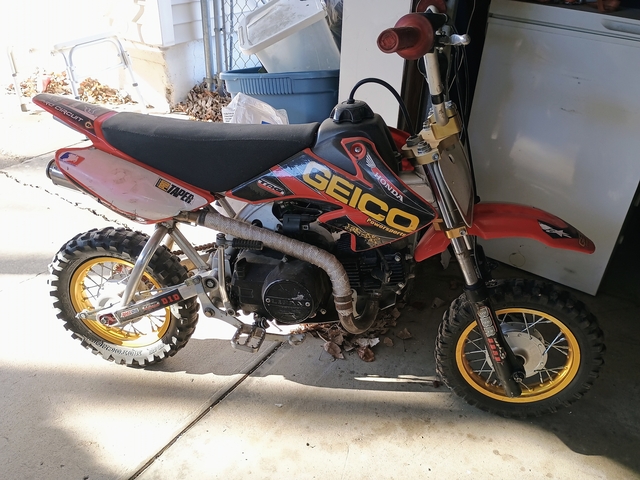 Needs carb cleaned, or new carb altogether. Doesn't have a choke plate(previous owners idea) and is cold blooded. Has a Lifan 125cc swapped into it and it's a blast to ride! Needs a tube for the rear tire as well!