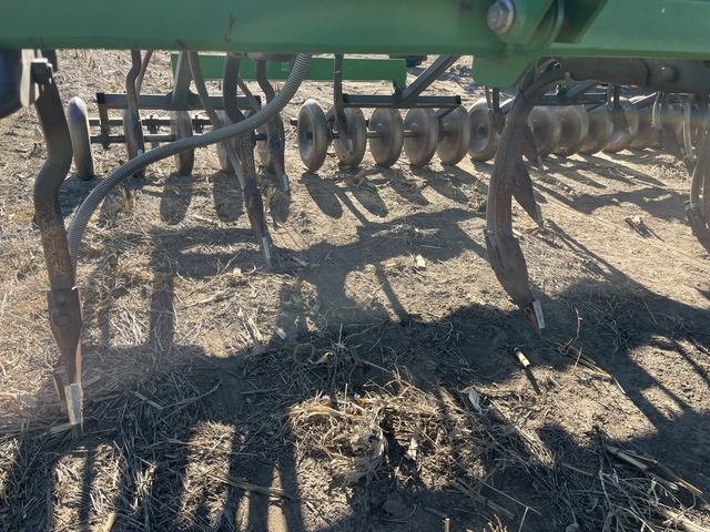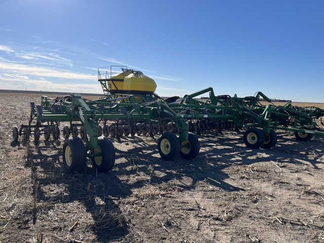 2008 JD 1830/1910 12" hoe air seeder, 60', 1 season on points, tow behind cart, 350 bushel 2 hopper cart, front is 150 bu., back is 200 bu., green deep groove meters in both