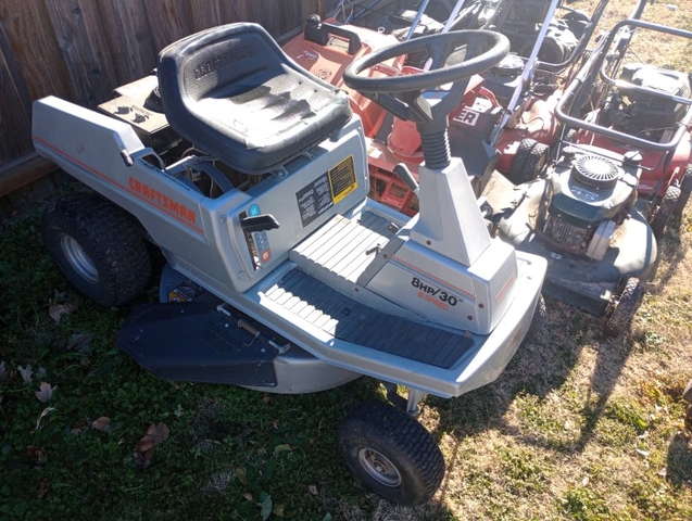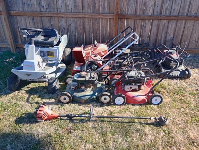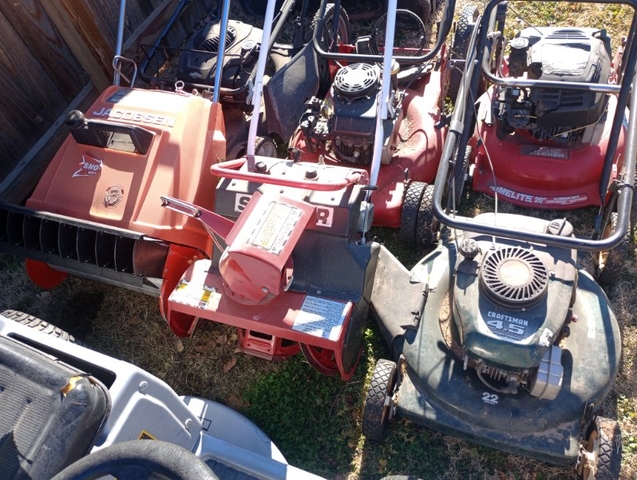 Craftsman Riding lawn mower, runs but needs carb work and battery. Push and self propelled mowers, weed eater, and 2 snow blowers all for $175