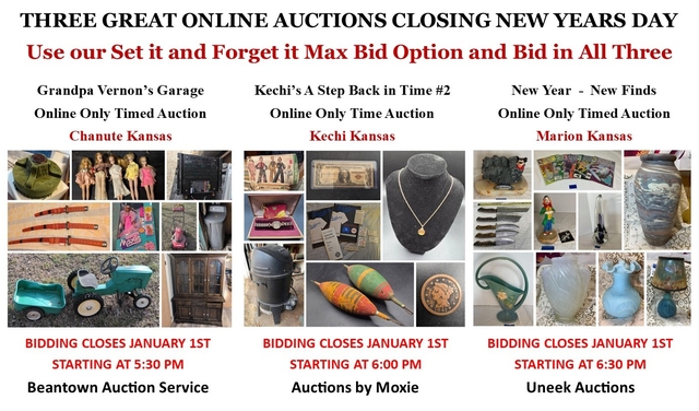 Our New Years Day Online Auctions are right around the corner. Get your bids in before it's too late in one or all three of our great online timed auctions CLOSING OUT on Thursday, January 1st. First up starting at 5:30pm it's Grandpa Vernon's Garage out of Chanute Kansas by Beantown Auction Services with 256 lots and shipping is available for many of the items in this sale. Next up, starting at 6:00pm it's Kechi's A Step Back in Time Part 2 out of Kechi Kansas conducted by Moxie Auctions with 617 lots and here again, shipping is available for many of the items in this sale. Last but not least, starting at 6:30pm it's a New Year, New Finds by Uneek Auctions coming at you out of Marion Kansas with 769 lots. Shipping is also available for most of the items in this sale. Get your Auction Action going on now and be sure to use our "Set it and Forget it" Max Bid option so you never miss out and never pay more than you are willing to go. Bid Now!