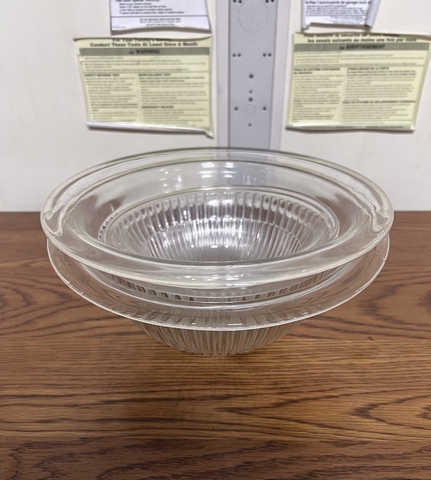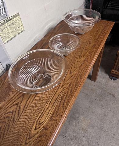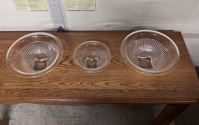 Have a 3 Pc Set of Clear Glass Nesting Mixing Bowls. Have 2 of the larger ones and 1 of the smaller one, all have light wear from being used. Measurements are (2)- 10” Diameter (1)-7” Diameter. (NO HOLDS)(No Deliveries)(CASH ONLY) LOCATED IN HAYS, KS.