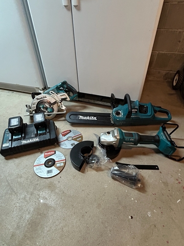 Makita 32 Volt tools. XAG12 36V cut-off/angle grinder (never used); XSR01 36V circular saw (used just a few times); XCU03 14" 32 V chainsaw- with three chains (used just a few times). DC18RD 2 port multi 18V charger with 2 batteries. All items like new.