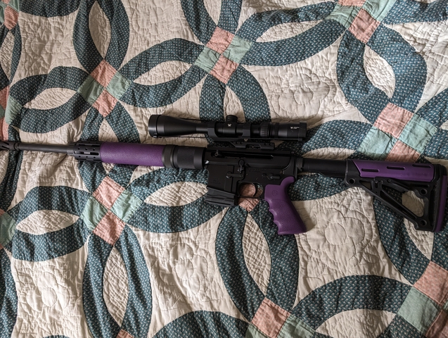 I have a Left handed .223 AR-15. Purple furniture. 4 x 12 44 Vortex Sonora scope and AR mount. Shoots good.