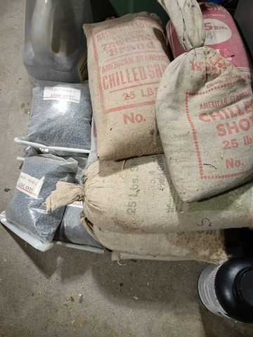 Several full and partial bags of shot I inherited after my Dad passed. Shot sizes are 9, 8, 7 1/2, 6, 5, 4, and T buck. Asking $2/pound.