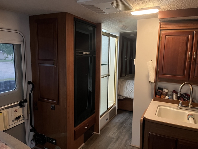 Inside, you’ll find a thoughtfully designed floorplan featuring a cozy living area with a sofa and booth dinette, perfect for meals, games, or simply relaxing. The fully equipped kitchen includes a refrigerator, microwave, three-burner cooktop, oven, and ample cabinetry, giving you everything needed to prepare home-style meals on the road. The private rear bedroom features a walk-around queen bed with wardrobe storage, while the split bath design offers a roomy shower and separate vanity for convenience.