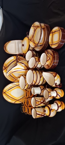 8--(9 5/8") Luncheon Plates; 8--Coffee/Tea Cups w/ 8-- Saucers Set; 8--Soup/Salad Bowls (5 1/4"), 8--Striped Clear Glasses; 2--(5 1/2") 16 oz. Tumblers; 2--(9") Vegetable Serving Bowls; 2--(8") Round Vegetable Serving Bowls; 1--Gravy Boat; 1--(11") Oval Divided Vegetable Bowl; 1- (12") Oval Platter; 1-- 2.25 Qt. Round Covered Casserole; 1--(5" bulb) 16 oz. Jug; 1--Sugar Bowl w/ Lid; 1-- Creamer; 1--Salt & Pepper Set; 1--(12"0 Chop Plate; 1--2 Qt Jug (10 1/2").