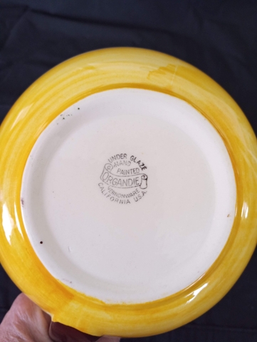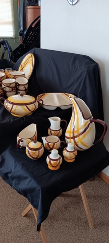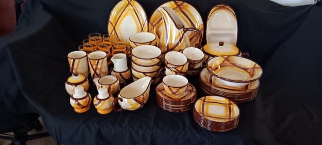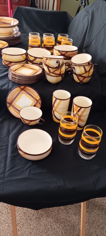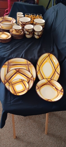 Organdie Hand Painted Plaid- Vernonware by Metlox/Poppy/Verno (METORG). (1937-1958).Dinnerware serves 8--56 pieces total. Brown & Yellow Plaid, Rim Shape, Hand Painted. Excellent Shape, no chips, no cracks, was Mother's wedding present in 1952.