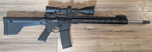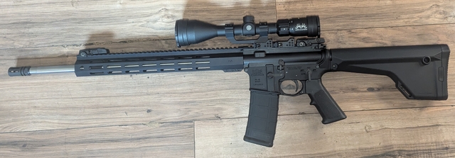 Never fired PSA15 with lightweight 20 inch stainless steel upper receiver, a 3x9 50mm sig buckmasters scope in a QD monstrum cantilever mount, Magpul Moe rifle stock, Magpul enhanced trigger guard, Magpul flip-up sights and 1 30 round magazines. Willing to trade for a bolt action in .308 with or without cash on top depending on the rifle or a S&W M&P 2.0 9MM with a 5 inch barrel & $350