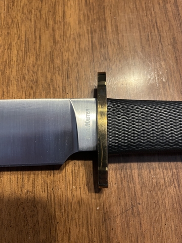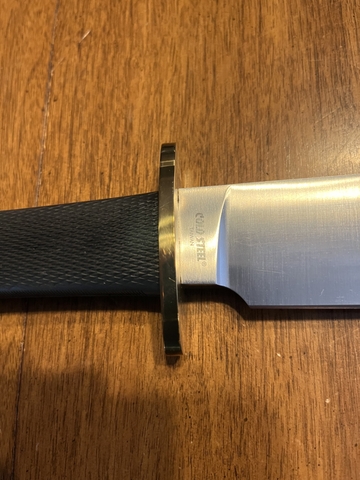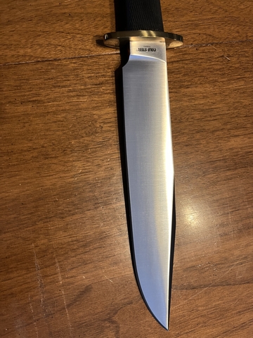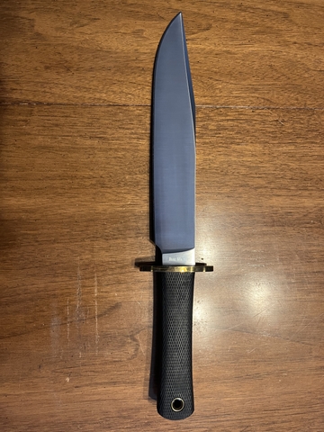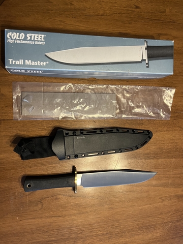 This is a Cold Steel Trailmaster Bowie. It was purchased and just put away. It has never been used. Nothing has ever been cut with it, the sheath and box and original packing sleeve are included. Cash only, please.