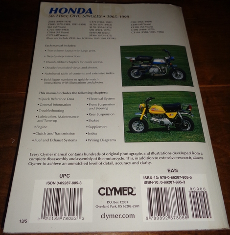 This is a Clymer repair manual for '65 - '99 Honda 50cc-110cc OHC singles. It's in very good shape.Closed the shop; selling inventory at large discount.