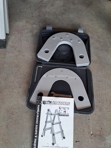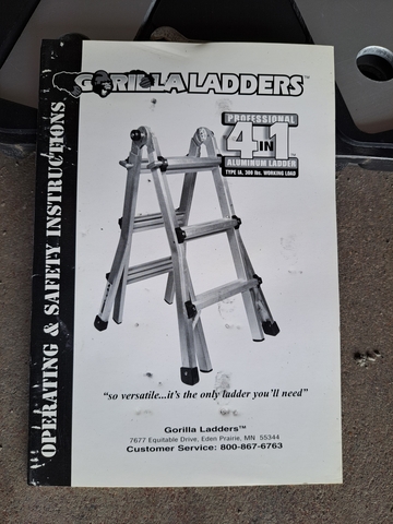 GORILLA LADDER AND STABLIZER KIT, 375 LB CAN USE AS AN EXTENSION LADDER OR STEP LADDER. FOLDS IUP SMALL ENOUGH TO FIT IN A TRUCK OF A CAR.