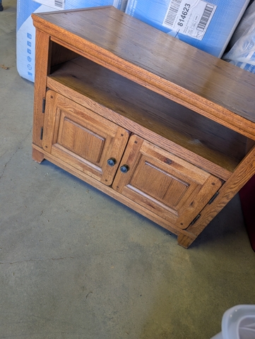 Rustic wooden TV stand featuring a stunning burnt finish. Measures 32" W x 20.5" D x 24.5" H. The spacious cabinet provides plenty of storage for media, books, and more.