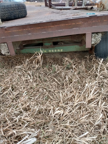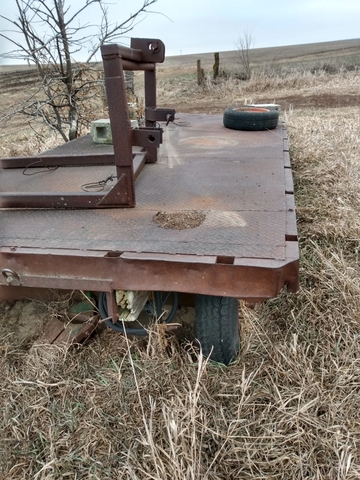 7' x 14' HD running gear flat bed hay trailer steel floor. Needs tires.