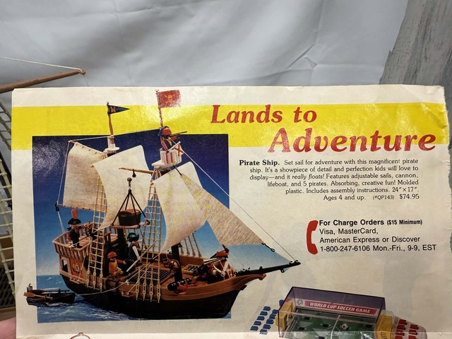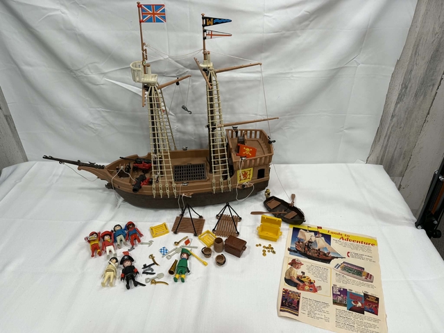 1970's playmobil pirate ship. It is missing the sails. all other pieces and people are there. Bonus there is extra people and pieces. No box. Have an original ad for the toy showing original pice $74.95.