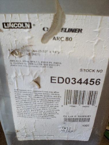 For sale an unopened 50lb can of Lincoln EDO34456 welding rod. Lincoln calls it Pipeliner Arc80. 5/32in x 14in size. Sells new for around $350. $150 CASH. Located in Tribune, KS. 67879. Message me for my cell number.