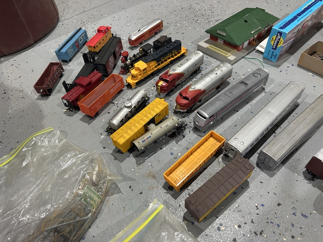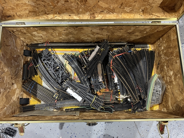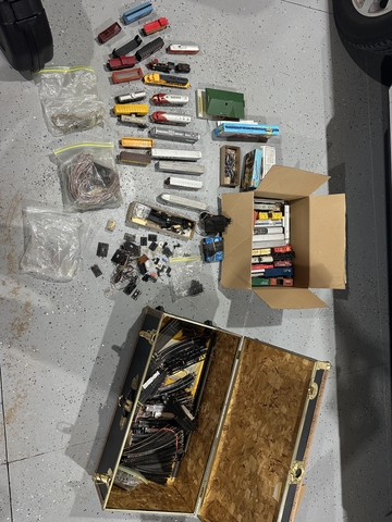 Sold as a lot. Trains, cars, tracks, switches, power supplies, wires, in unknown condition. 100$ obo