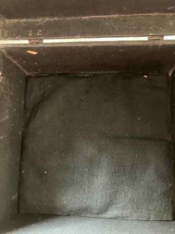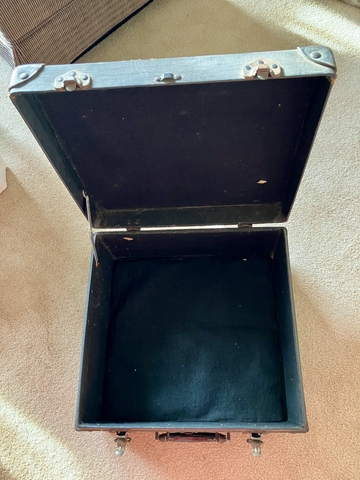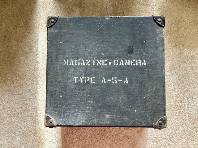 This WWll case was for carrying an airplane gun camera magazine. It's 15"x16" on top and 9" deep when closed. It's 6.75" deep when the lid is opened. There's a small amount of padding on the inside bottom which is covered by black felt. It's clean but smells musty. It's in good condition for its age.