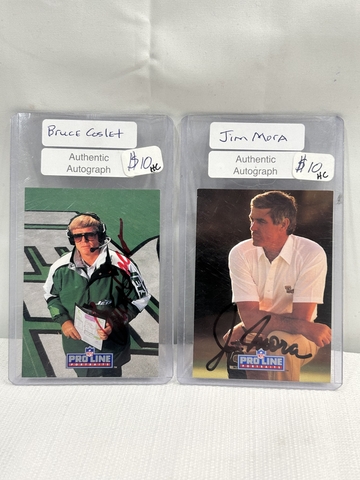 (2) 1991 pro line autographed #81 Jim mora and #260 Bruce Coslet bought them saying authentic autographed I can't guarantee if they are real (they are real ink not printed). $10 each