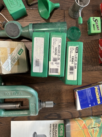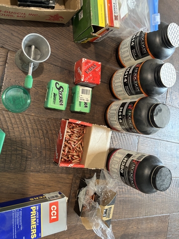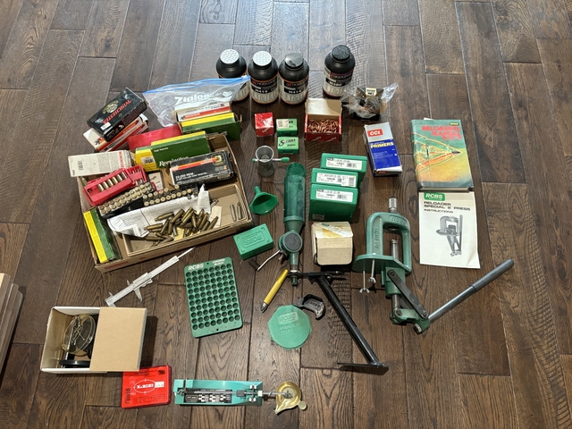 Complete RCBS reloading setup. Includes everything pictured. Here is a partial list of components 100cnt .22 40gr V-max, 200 cnt Sierra .22 40gr HP, partial box Nosler 130gr ballistic tip .270, @200 55gr .22 V-max, @600 200 large rifle primers, 2 new canisters and 1 partial of H414, 1 canister mostly full of H380. Lots of .22-250 brass and some.270. Easily $700 worth of value if you price it all out.