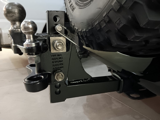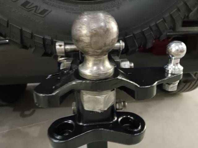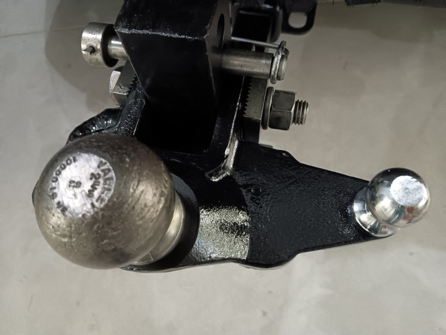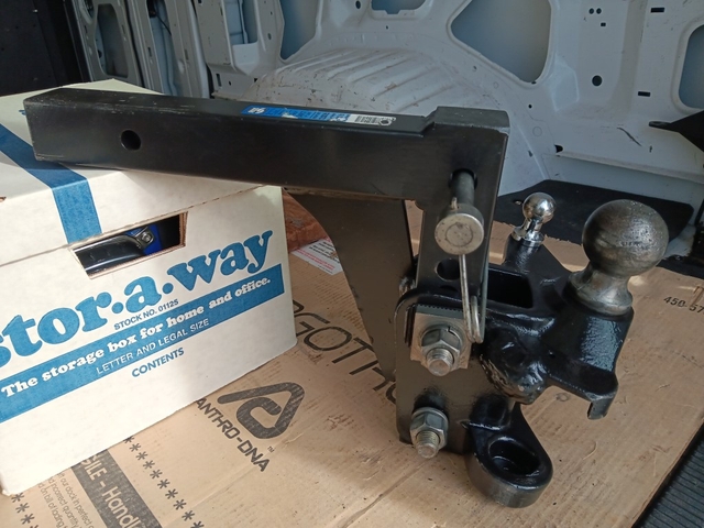 Weight Distributing Bolt-Together Head Trailer Hitch. 2 Inch Receiver size with 2-5/16" Ball. Has been reinforced/repaired and given new paint.