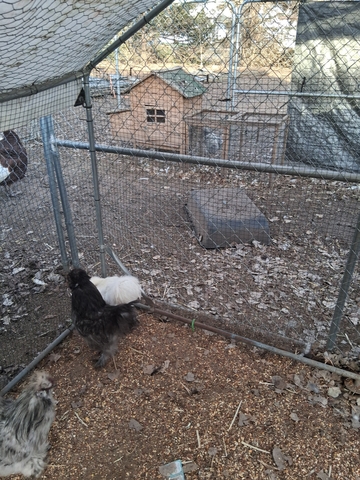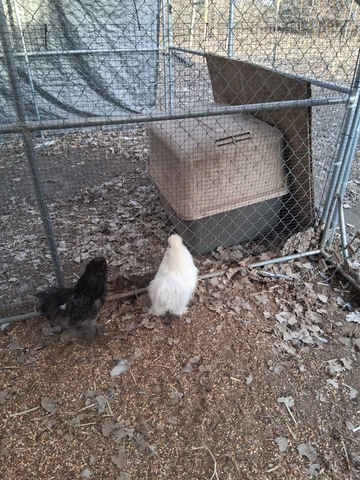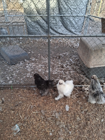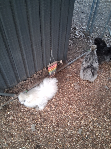 I have a white and black silkie roosters that need a new home as I have 2 too many. 10.00 a piece or trade for 2 guinea hens. These roosters will be a year old in april. The splash Rooster is not for sale. The blue may look black but was blue when a baby.