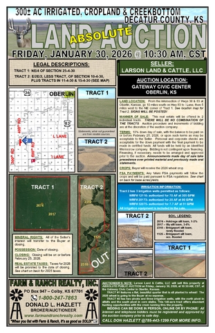 AUCTIONEER’S NOTE: Larson Land & Cattle, LLC will sell this property at ABSOLUTE PUBLIC AUCTION on Friday, January 30, 2026, at10:30 AM, CST, at the Gateway Civic Center in Oberlin, Kansas.