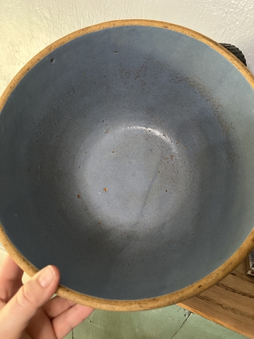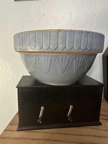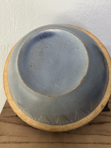 Old Pottery Blue Stoneware Picket Fence Mixing Bowl The bowl is unmarked5” tall 10” round In very good condition for its age does have imperfections in the pottery glaze. Cash and carry Norton Ks
