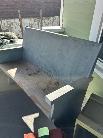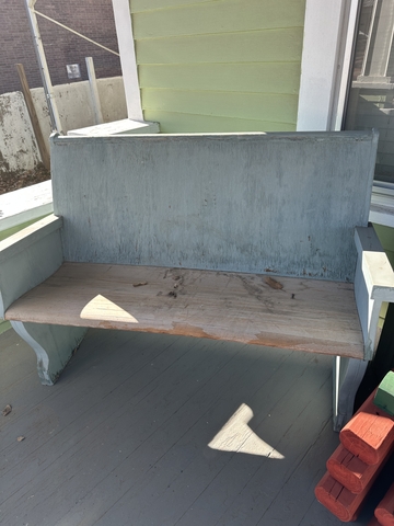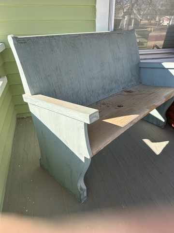 Painted Church pew has been outside on a porch.