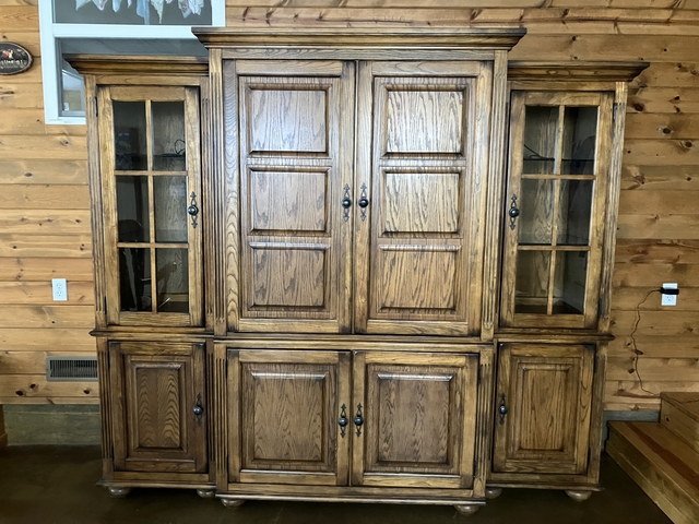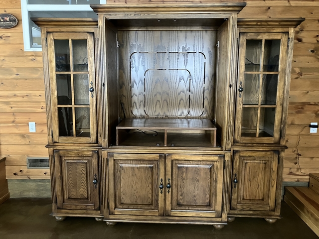 Solid Oak Entertainment Center for sale. This is very nice and solid entertainment center that does not fit our space anymore. Both end sections have lights. It is made in 3 sections for moving.