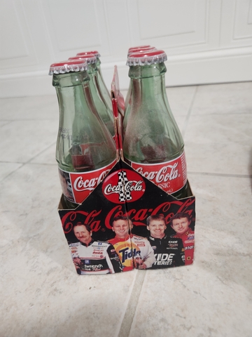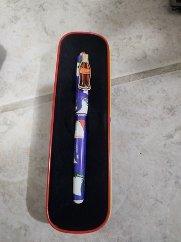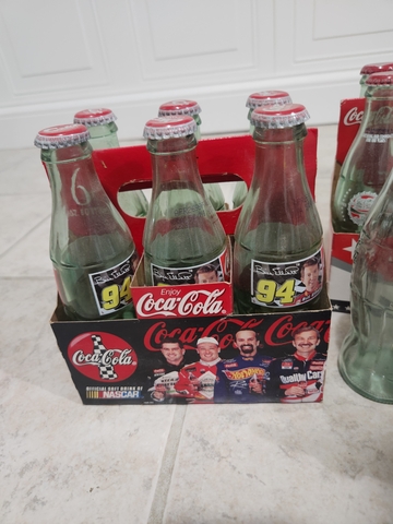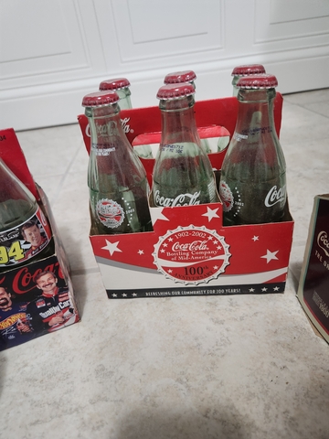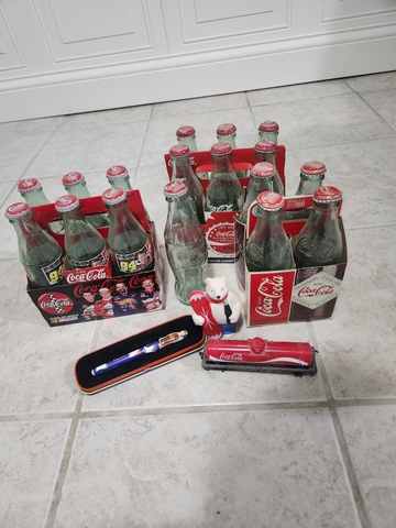 Various coca cola collectibles for sale. The single bottle is from the 1980s and the rest are from the 90s and early 2000s. The pen is from 1995.