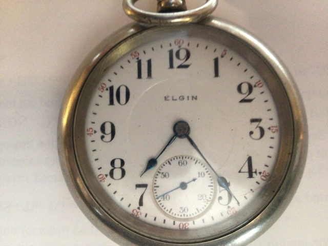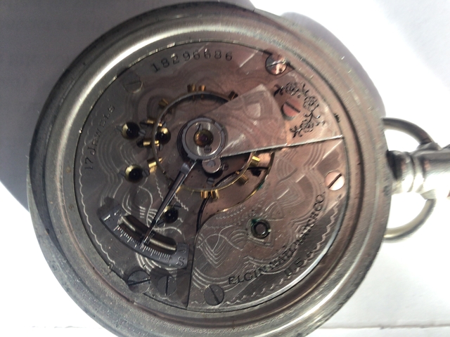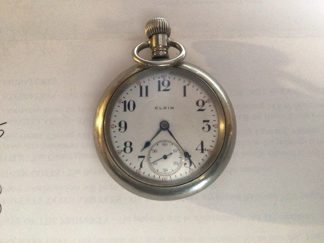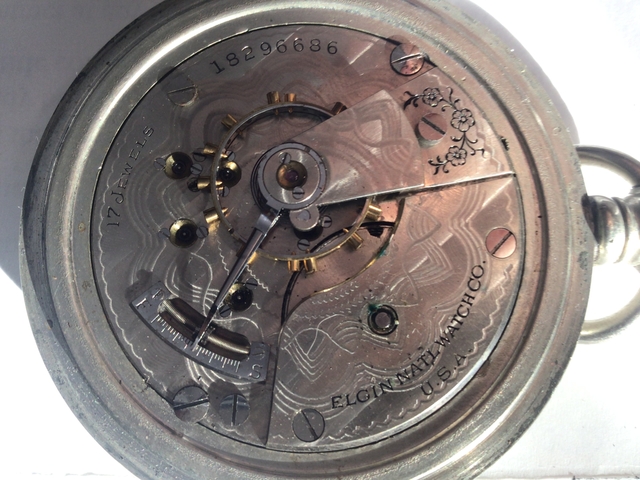 1915 Elgin pocket watch. This is the railroad model, which has a higher jewel count (17). Not running, but I can jar it a little and it will run for a few seconds. Just needs cleaning? For whatever it means, here's what the internet says: grade 336, model 5, class 106, year 1915, total made 272,700, size 18s, jewels 17, The serial # is 18296686. Back screws on. Get it running, it's worth at a minimum of several hundred. Cash price of $85. No checks, no trades, no delivery, no saves, no texts. Contact me here or at six 207925four nine8. Keep trying, sometimes hard to get.