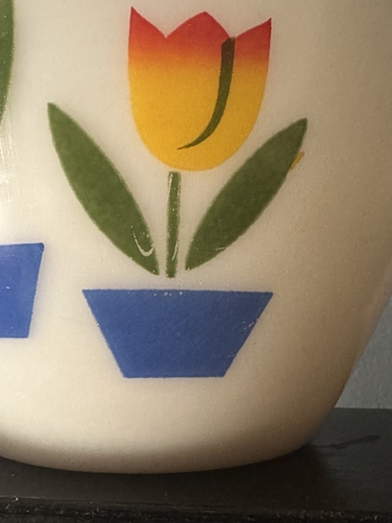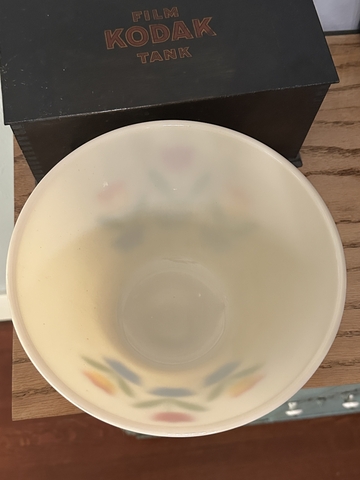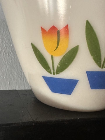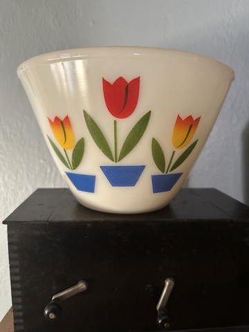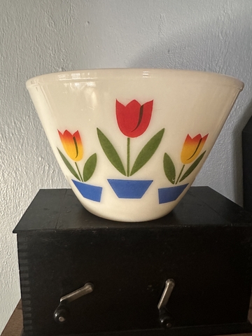 1950’s Fire king tulip milk glass white glass mixing bowl. 5 1/2” tall 8 1/2” round. Does have some wear on the tulips as pictured Cash and carry Norton Ks