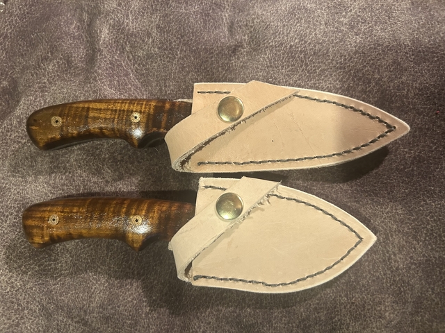 Sheaths are 7-8 ounce leather hand cut and hand stitched, functional not fancy.