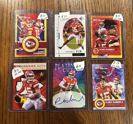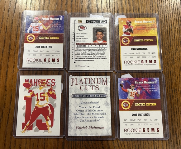 (6) Kansas City Chiefs Patrick Mahomes football cards. They are in penny sleeves and top loaders.
