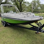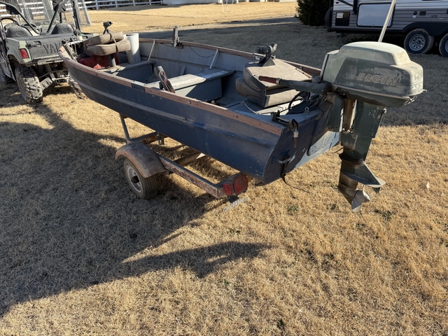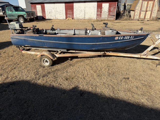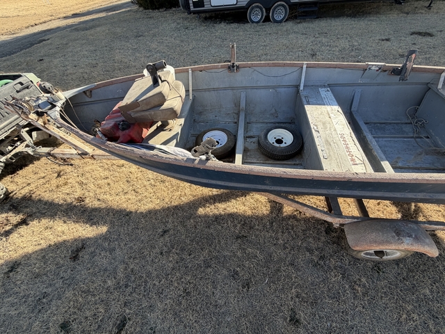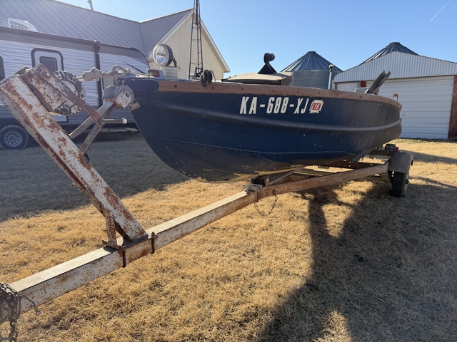 Setting on a nice tilt trailer with two spare tires. Was running about 5 years ago and stored inside since. Engine is free and has good compression. Has 2 fishing seats with umbrellas, lots of pole holders and 2 anchors. Bow mounted fuel tank. Includes two Humminbird 561 fish finders and transducers.