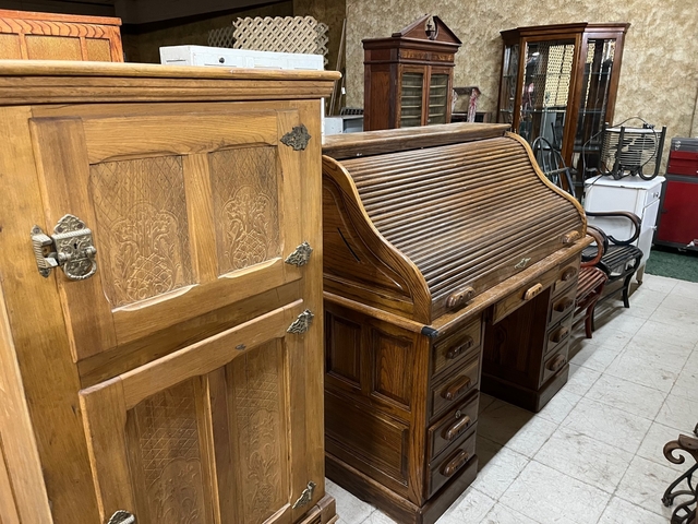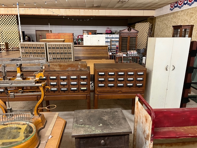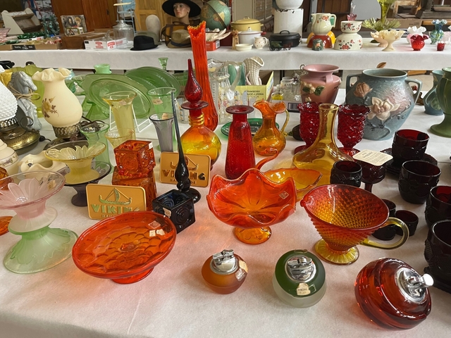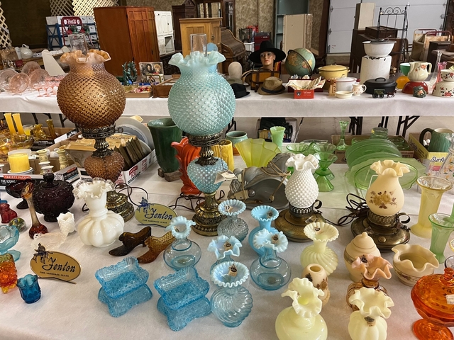 Selling Sunday 50+ Pieces Fenton including Lamps, 50 Pieces Viking, Roseville, Hull, Redwing, Kerosene Lamps, Several Butter Churns including Dazey, 100+ Pieces Fiesta and Completer Pieces & Stemware, Pioneer Woman Bakeware, Willow Tree Nativity, Rachel Ray Bakeware, 2 Antique Oak Library Tables, 2 Wood Library 30 Drawer Card Files, Antique Wood Caster Shoe Store Rack, 2 -USPS Brass Combination Door Bank Cabinets, Bentwood Chairs, Library Shelves, Oak Ice Box, Oak Roll Top Desk, Coca Cola Store Display, Pop Bottle Crates, Pop Bottles, Uranium Glass, Pink Depression, Carnival Glass, Forest Green Glass, Crystal, Quirky MCM Figurines, Murano, Swung Vases, Banks, Marbles, Elephant Quilt, Antique Bicycle, Antique Swivel Stools, Manual Typewriter, Gym Basket Rack, 50’s TV’s, Saddle Stand, Saddles, Tools, Brewerania, Antique Floor Lamps, Oil Table Lamp, Pyrex, Hoosier Cabinet Top, Antique Theatre Chairs, Wood Piano Roll Cabinet, Leather Area Rug, Boho Area Rug, Many Swivel Office Chairs, Antique Toys, Crank Drum Pump, Antique Library Desk Chairs, Brach’s Candy Displays, Valero Advertising sign, Mantle & Wall Clocks, MCM Metal Musical Note Sculpture, “new/old” stock Josef Birthday Month & Year Figurines, Avon Cape Cod Dinnerware Set with Completer Pieces, Enamelware, Men’s’ Hats, 3 World Globe, KS School Pull Down Map Set in Wood Box, Shelving, Workbench, 2 gal. Redwind Butter Churn, Damaged Waconda Crock Jug, Spongeware, Luxury Clue Game, Wooden Mantle, Fishing Equipment, Carrom Boards, Metal Typewriter tables, 2 Wooden Trunks, 2 Antique Store Scales (Dayton Computing w/glass tray & Detroit Auto early 1909’s), Drafting Table, Antique Windows, Antique Cabinets, Computer Storage Desk, Antique Wood 2 Wheel Cart, Superior Metal bottom only Churn, Cast Iron Skillet with Lid, Amberina, Barware, Christmas Decor, Empoli Glass, Warming Light, Velvet Pictures, Oak Wall Telephone, Antique Motorcycle Denver Capital Photo, Wall Photos, Keystone 8 mm Projectors, 3.6’ diameter Brass Round Wall Hanging, Little Giant Folding Ladder & More!