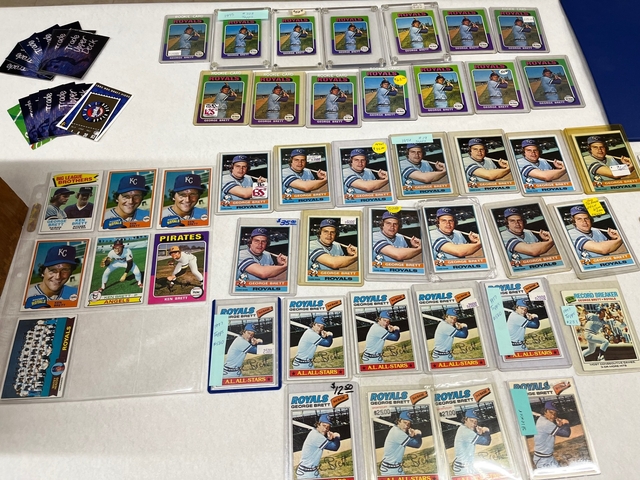 Selling Saturday 200 lots Sport Cards. Over 60 George Brett Raw Rookies, Multiples of all years played, Team Sets, Memorabilia, Binders with Brett, Graded Mahomes, Kelce, Jordan, Many Other Rookie Cards - all sports. Player cards, Beam Team Basketball Cards, Boxed Sets, 60’s thru present! Text for list!